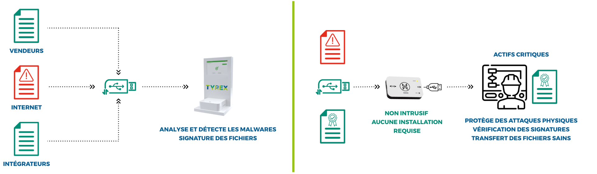 The TYREX hardware agent, developed in partnership with SecLab, makes it possible to secure and control the use of USB media in critical environments, in particular industrial and OIV environments. While the TYREX station certifies the absence of malware, the SXU box protects against physical attacks, providing a maximum level of security, including against unknown threats. The SecLab box has been awarded with the ANSSI First Level Security Certification.